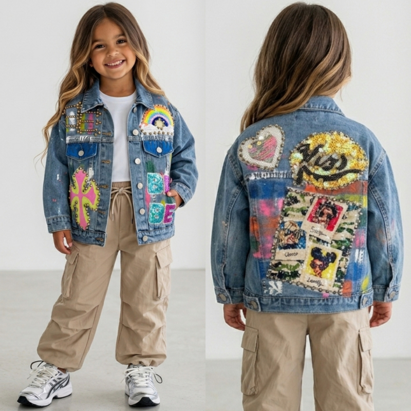 - Trendy meisjes spijkerjasje met pailletten en patches