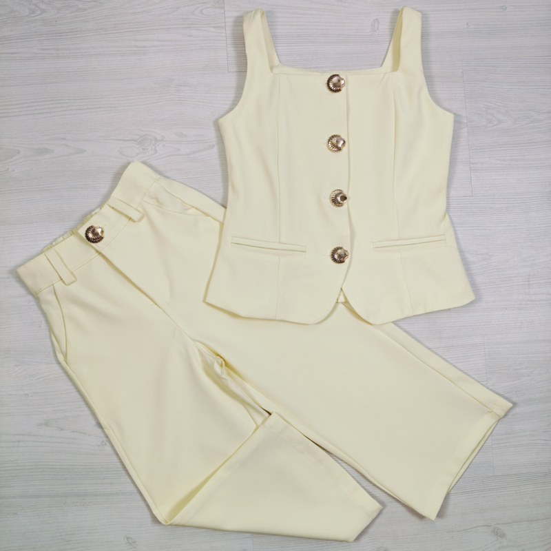 Artikelnummer: LG.YY3433g ww2 OverzichtDeze stijlvolle meisjes set met top en flared broek is perfect voor een elegante en trendy look. De set bestaat uit een mooie mouwloze top met opvallende gouden knopen en een bijpassende flared broek die zorgt voor een modieuze en comfortabele pasvorm.