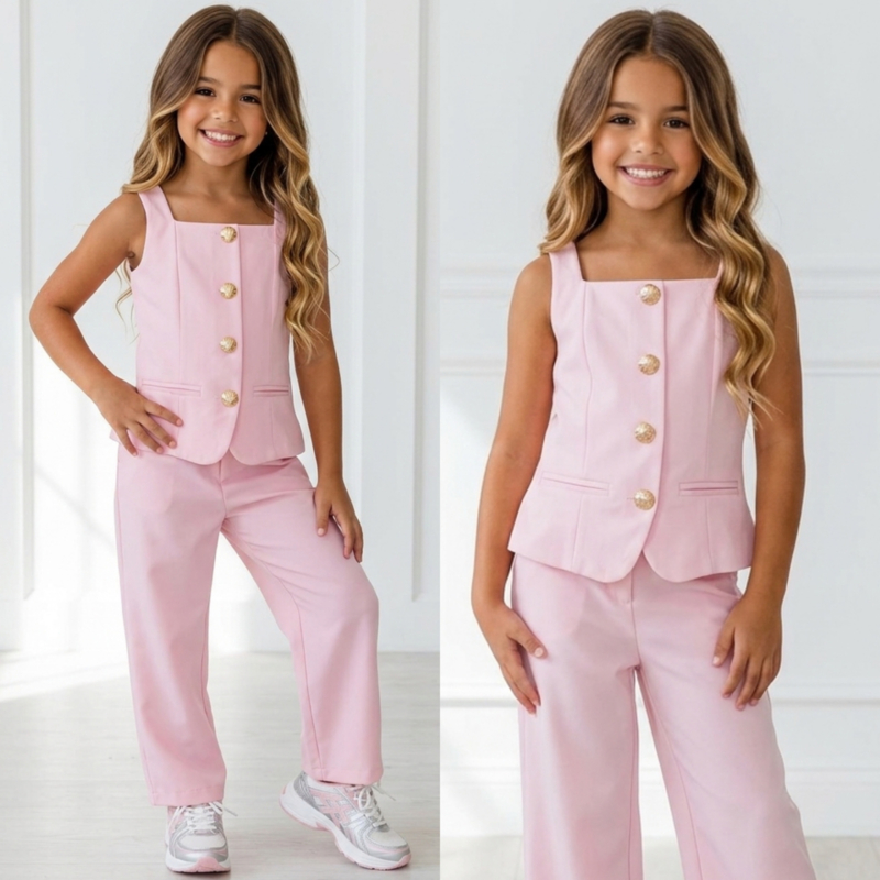 Artikelnummer: LG.YY3433r OverzichtDeze stijlvolle meisjes set met top en flared broek is perfect voor een elegante en trendy look. De set bestaat uit een mooie mouwloze top met opvallende gouden knopen en een bijpassende flared broek die zorgt voor een modieuze en comfortabele pasvorm.