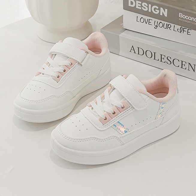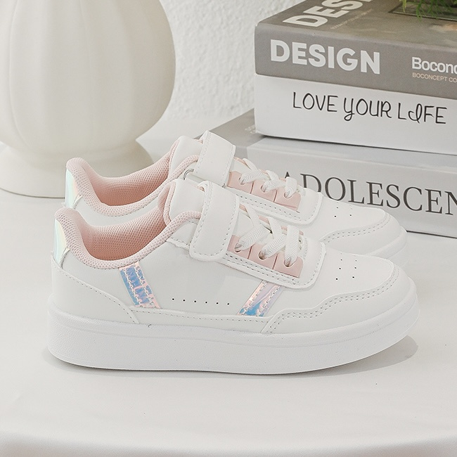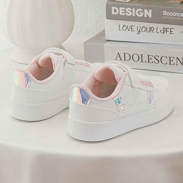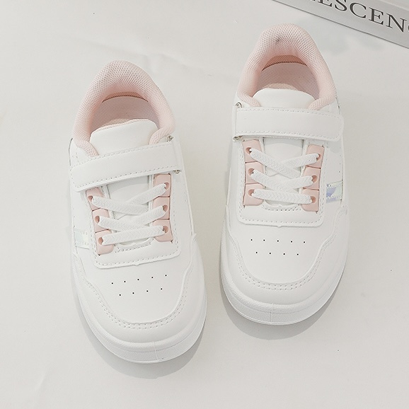 Artikelnummer: 1808ww2 OverzichtDeze schattige meisjes sneakers in wit met roze details zijn perfect voor kleine fashionista’s. De schoenen hebben een trendy en sportieve look met subtiele holographic strepen aan de zijkant, wat zorgt voor een speelse en moderne uitstraling.