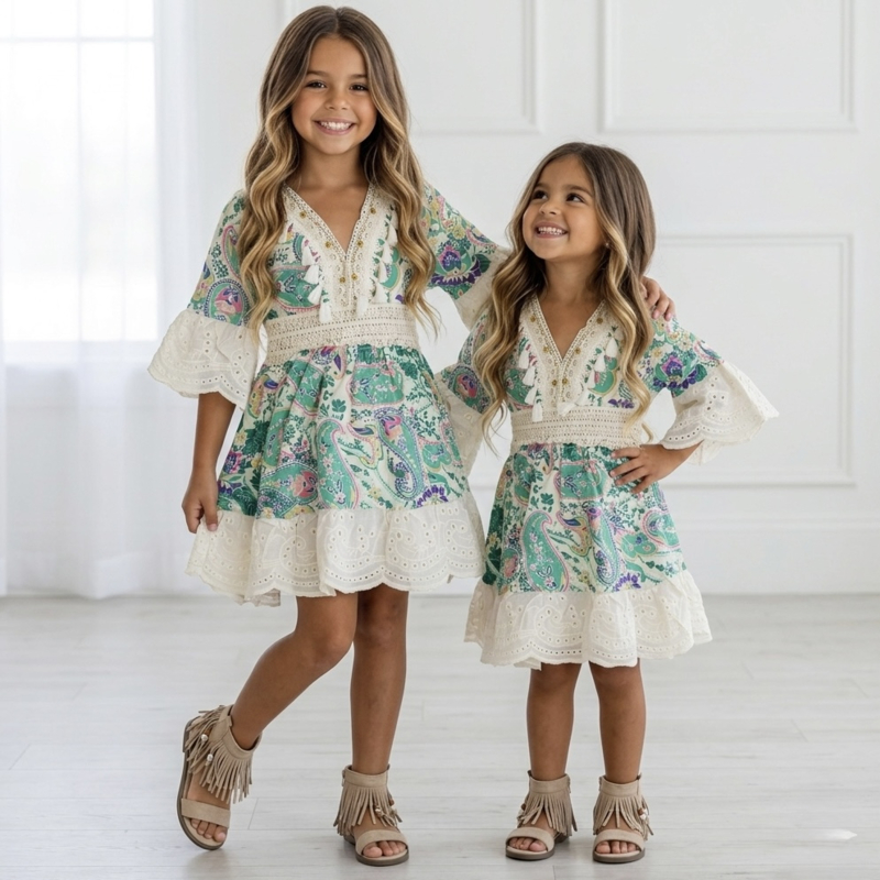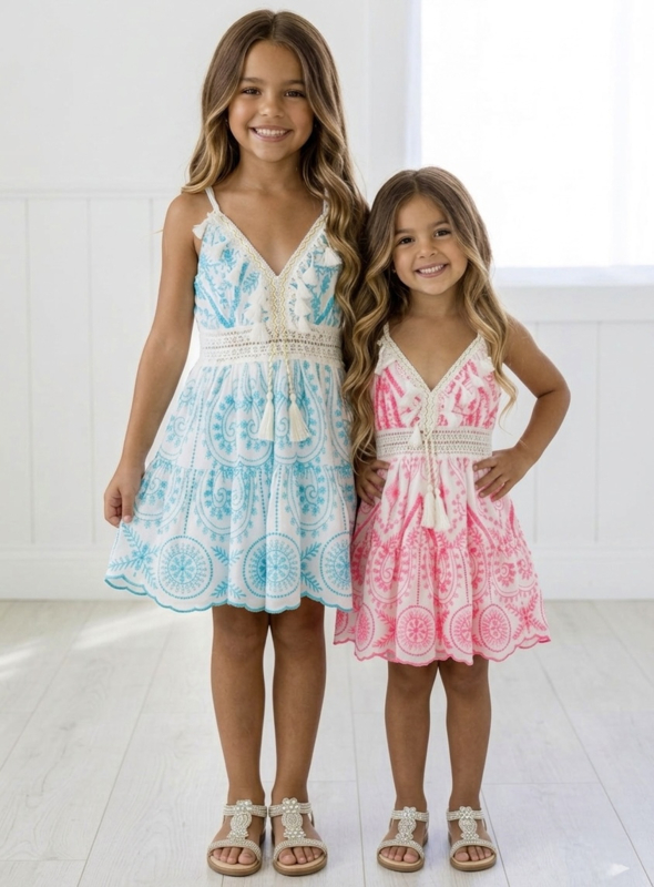 Artikelnummer: HN.1616r OverzichtDit prachtige boho meisjesjurkje met borduurwerk en kwastjes is perfect voor zonnige dagen. De jurk heeft een elegante V-hals met sierkoord en speelse kwastjes, dunne schouderbandjes en een mooie gehaakte tailleband die zorgt voor een comfortabele en stijlvolle pasvorm.