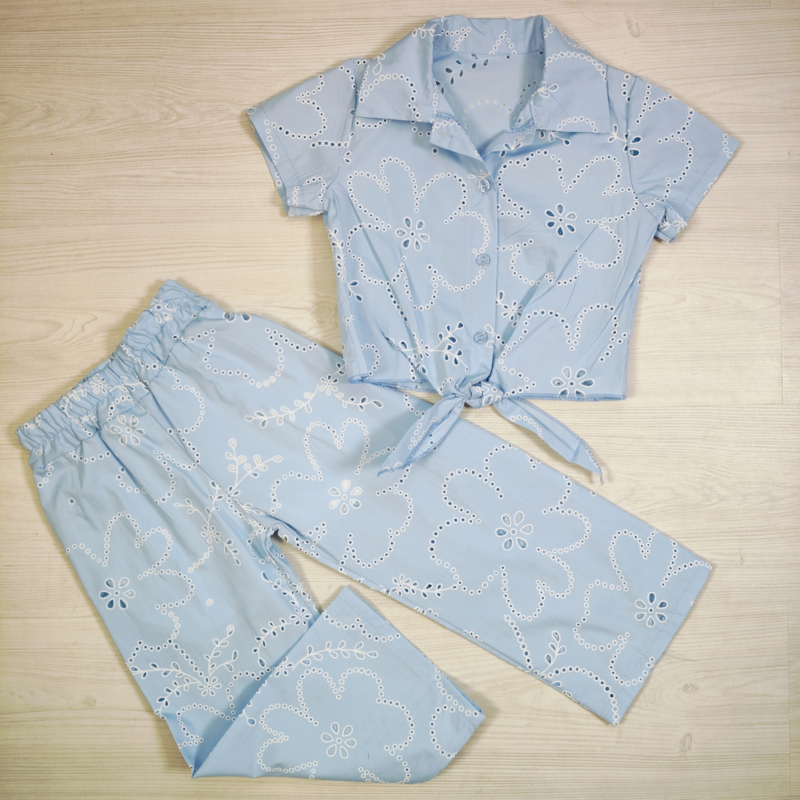 Artikelnummer: HN.70539b OverzichtDit stijlvolle meisjes zomersetje met broderie patroon is een perfecte combinatie van trendy en comfortabel. De set bestaat uit een korte blouse met kraag en strikdetail en een wide leg broek, wat zorgt voor een moderne en elegante look.