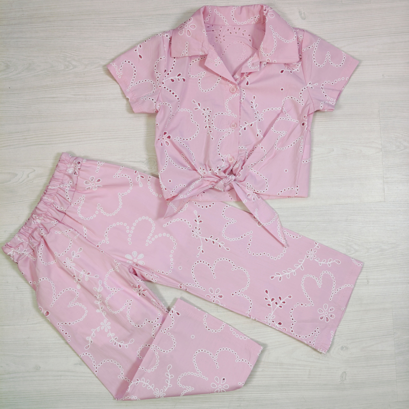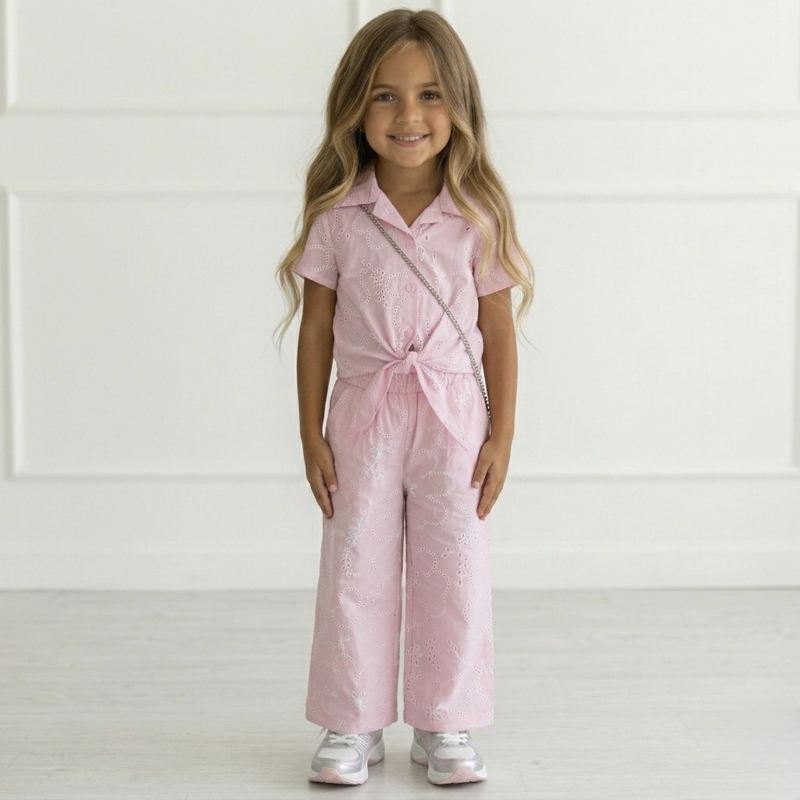 Artikelnummer: HN.70539r ww2 OverzichtDit stijlvolle meisjes zomersetje met broderie patroon is een perfecte combinatie van trendy en comfortabel. De set bestaat uit een korte blouse met kraag en strikdetail en een wide leg broek, wat zorgt voor een moderne en elegante look.