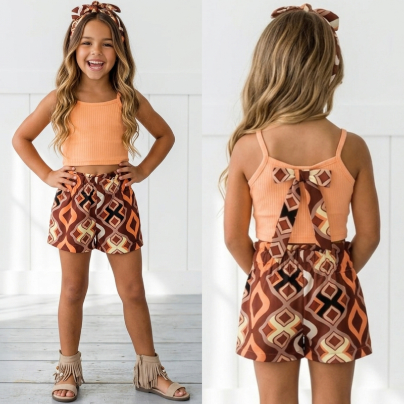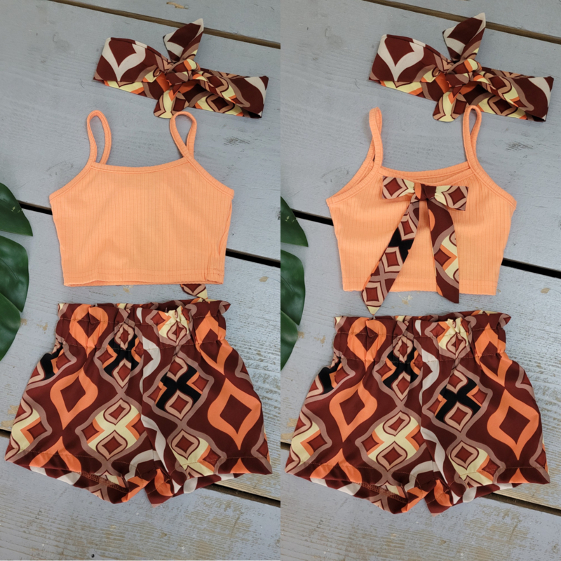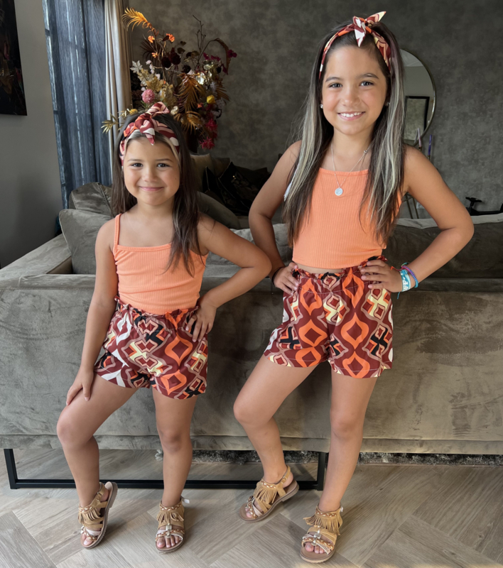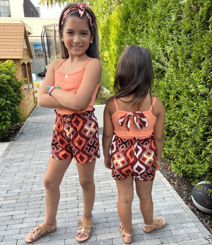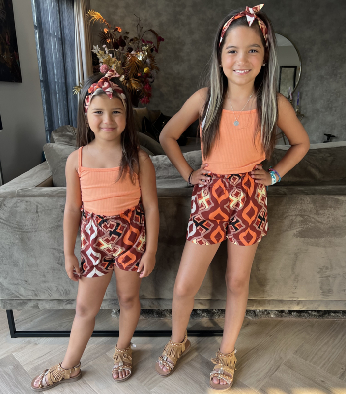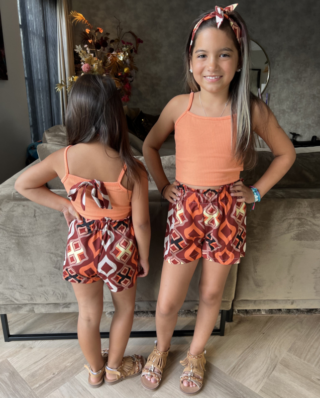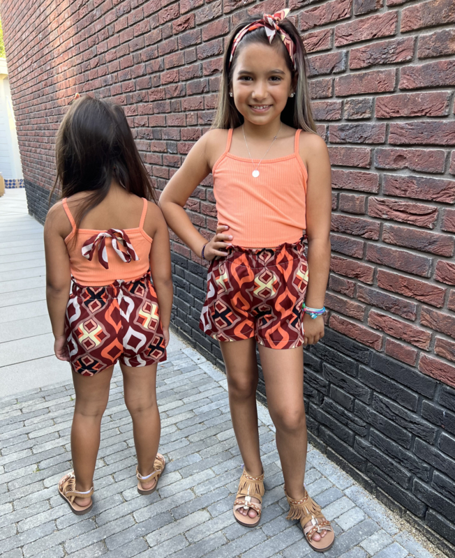 Artikelnummer: LG.22f070o ww2 OverzichtDit super trendy meisjes setje is een echte zomerse must-have! De set bestaat uit een zachte rib top met smalle bandjes en een prachtige strik op de achterkant. Het bijpassende shortje heeft een speelse print in warme boho kleuren en een comfortabele elastische tailleband, waardoor het setje heerlijk zit en perfect is om in te spelen.