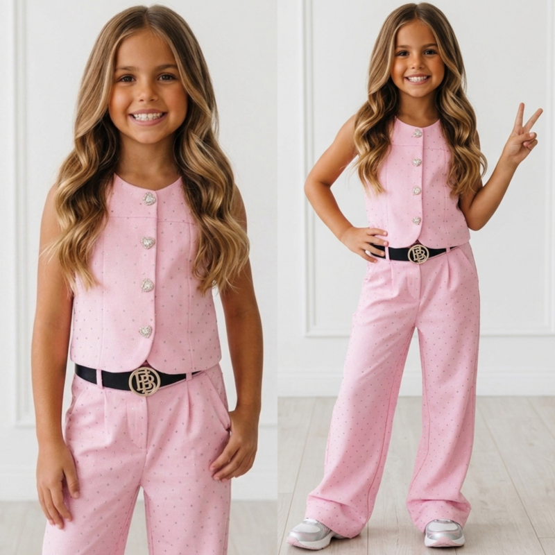 Artikelnummer: HN.70561r OverzichtDeze prachtige meisjes set met strass steentjes is een echte eyecatcher! De set bestaat uit een elegante mouwloze top met luxe hartvormige gouden knopen en een stijlvolle wide leg broek met subtiele glittersteentjes. De broek wordt geleverd met een stoere zwarte riem met gouden gesp, wat de outfit een extra trendy uitstraling geeft.