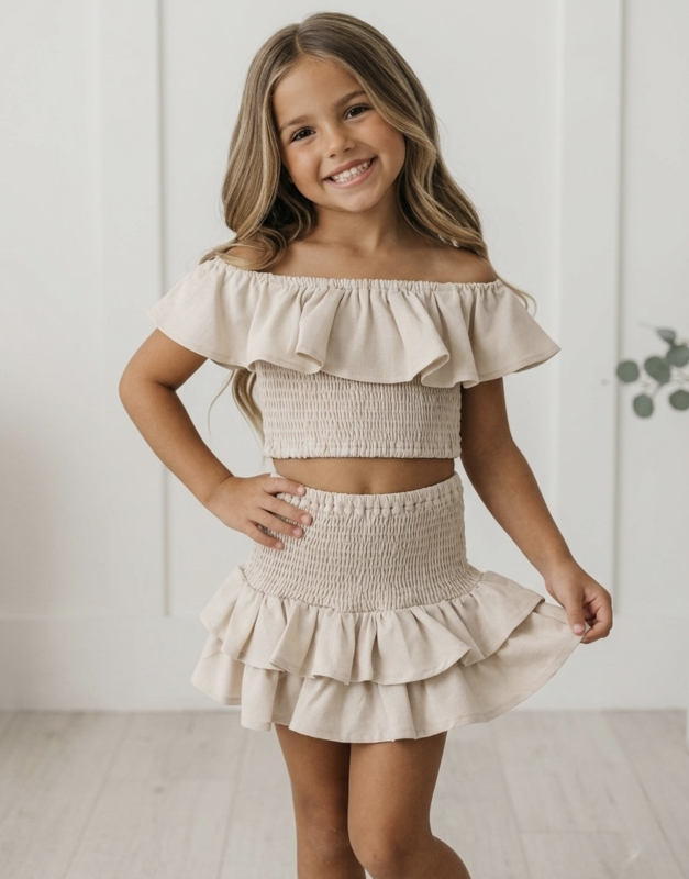 De elastische smock-stof zorgt voor een comfortabele pasvorm en een mooie aansluiting op het lichaam. De speelse ruffle details geven het setje een vrolijke en zomerse uitstraling. Perfect voor een dagje strand, vakantie, een feestje of gewoon een zonnige dag buiten.