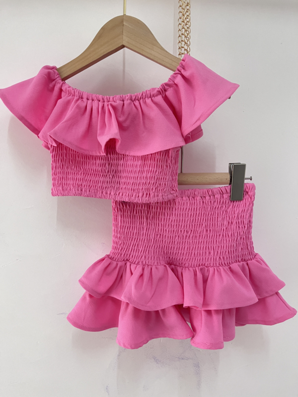 Artikelnummer: 25f063r ww2 OverzichtDit vrolijke roze meisjes setje is een echte zomerfavoriet! Het setje bestaat uit een trendy off-shoulder top met ruffle details en een bijpassende skort (rokje met broekje). Zo ziet het eruit als een rokje, maar kunnen meisjes er heerlijk vrij in spelen en bewegen.