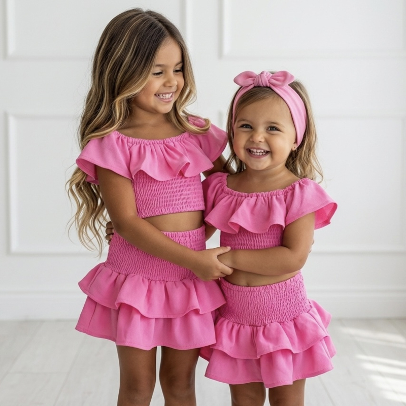 De elastische smock-stof zorgt voor een comfortabele pasvorm en sluit mooi aan. De speelse ruffles aan de top en de skort geven het setje een extra girly en zomerse uitstraling. Perfect voor warme dagen, vakanties, feestjes of een dagje uit.