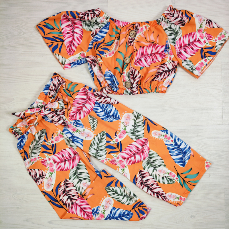 OverzichtDeze vrolijke tropische meisjes set is een echte must-have voor zonnige dagen! De set bestaat uit een speelse off shoulder top met knoopjes en een wijde broek met strikdetail, beide uitgevoerd in een kleurrijke leaf print. Perfect voor vakantie, stranddagen of gewoon een zomerse dag in Nederland ☀️