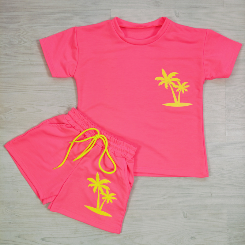 Artikelnummer: HN.70572r OverzichtDeze vrolijke meisjes zomerset met palmboom print is perfect voor warme dagen! De set bestaat uit een comfortabel T-shirt en een bijpassend short met een speelse palmboom opdruk. De felle neon kleuren geven de outfit een echte zomer- en vakantie vibe.