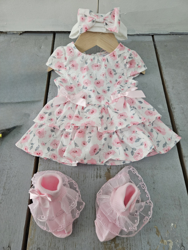 Artikelnummer: 24032 OverzichtEen prachtig baby meisjes jurkje setje met een romantische bloemenprint. Dit schattige jurkje heeft een zachte roze bloemenprint, speelse laagjes rok en twee sierlijke satijnen strikjes op de taille die het jurkje een extra lieve uitstraling geven.