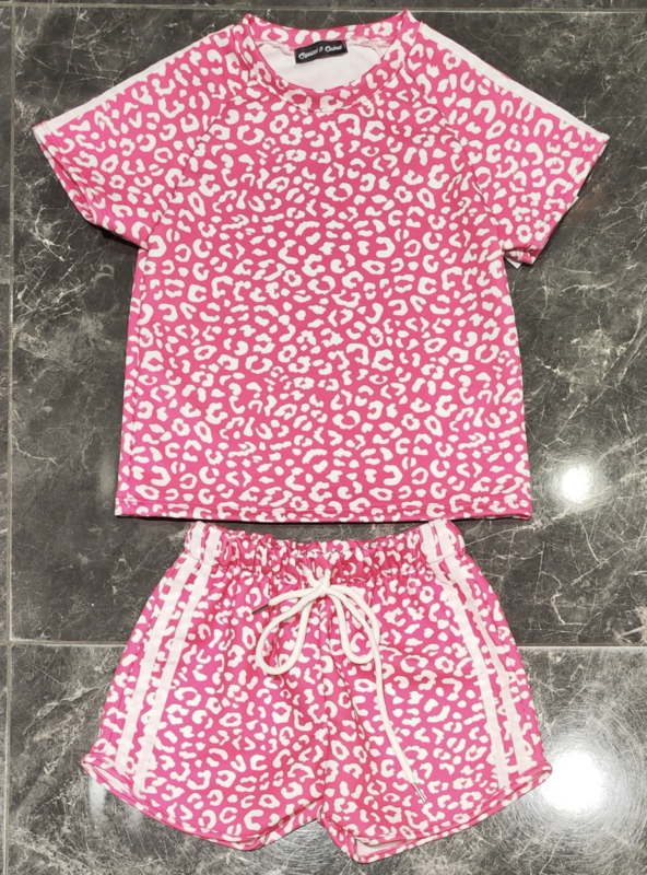 Artikelnummer: 26215r Overzichten stoer en trendy meisjes zomersetje met roze panterprint. Dit leuke setje bestaat uit een comfortabele korte top en een bijpassende short met elastische taille en strikkoord.