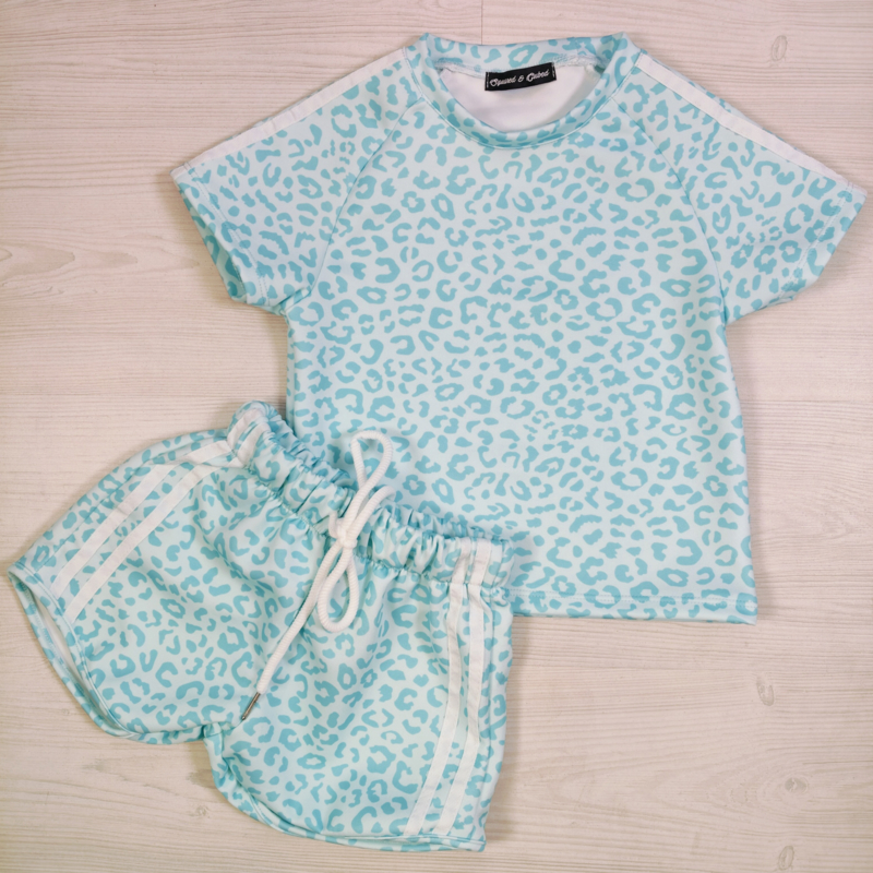 Een frisse en trendy meisjes zomerset met mintgroene panterprint. Deze stijlvolle set bestaat uit een comfortabele korte top en een bijpassende short met elastische tailleband en strikkoord.