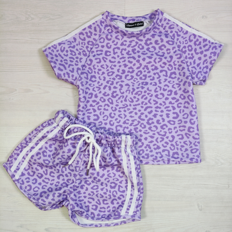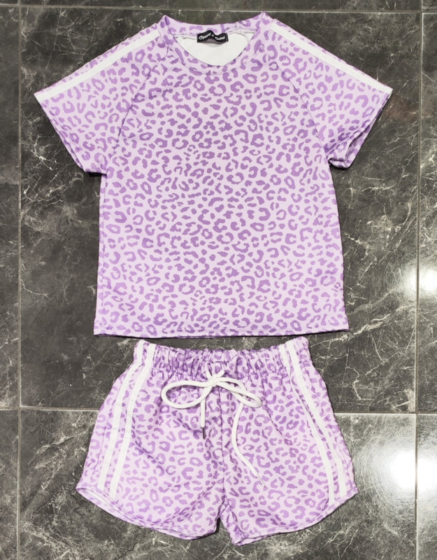 De zachte lila kleur gecombineerd met een speelse leopard print geeft het setje een hippe en zomerse uitstraling. De short heeft daarnaast sportieve zijstrepen, wat zorgt voor een extra trendy look. Perfect voor vakantie, een dagje uit of gewoon om lekker in te spelen.