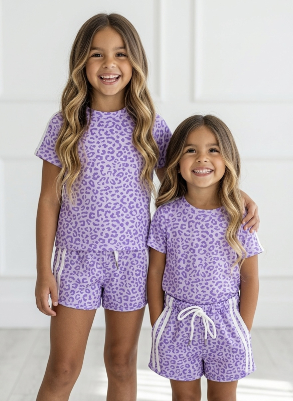 Artikelnummer: 26215l OverzichtEen trendy en vrolijk meisjes zomersetje met lila panterprint. Deze stijlvolle set bestaat uit een comfortabele korte top en een bijpassende short met elastische taille en strikkoord, waardoor het setje perfect zit en heerlijk draagt op warme dagen.