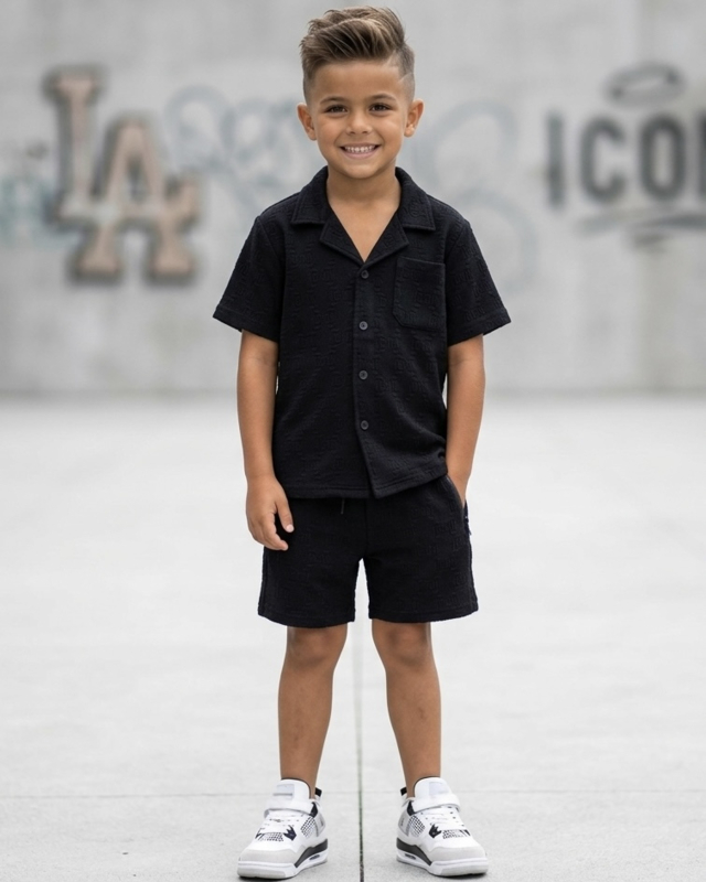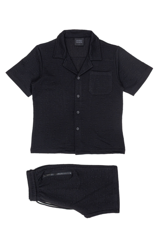 Artikelnummer: 1096z bka OverzichtDeze stijlvolle Boys sunset set in het zwart is een perfecte combinatie van comfort en een luxe zomerse uitstraling. De set bestaat uit een kort mouwen blouse met kraag en een bijpassende short. In de stof zit een subtiel monogram patroon, wat de outfit een trendy en exclusieve look geeft.
