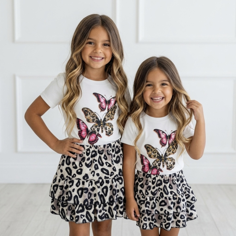 OverzichtDit trendy meisjes setje met butterfly print is perfect voor een stijlvolle en speelse look. De set bestaat uit een comfortabel T-shirt met opvallende vlinderprint en een trendy leopard skort (rokje met broekje). De top heeft verstelbare trekkoordjes aan de zijkant waardoor het shirt een leuke geplooide look krijgt.