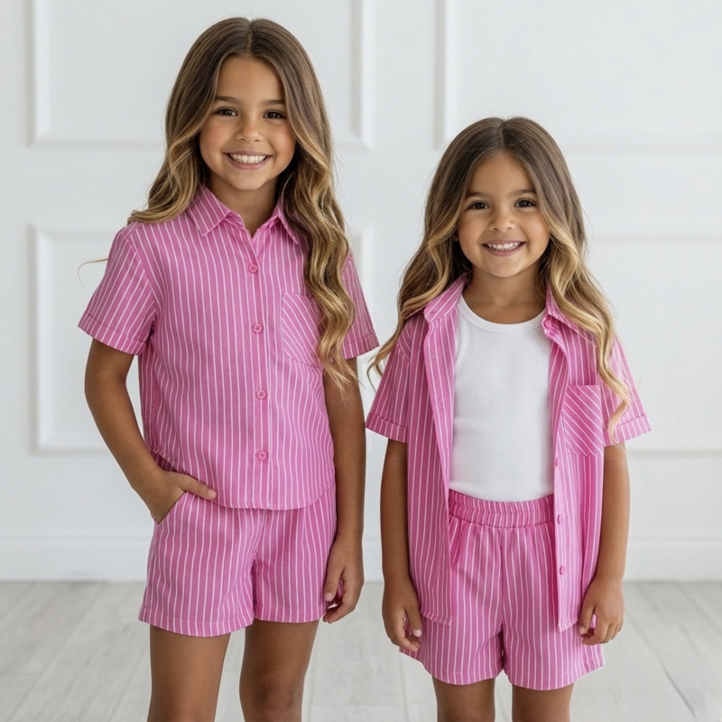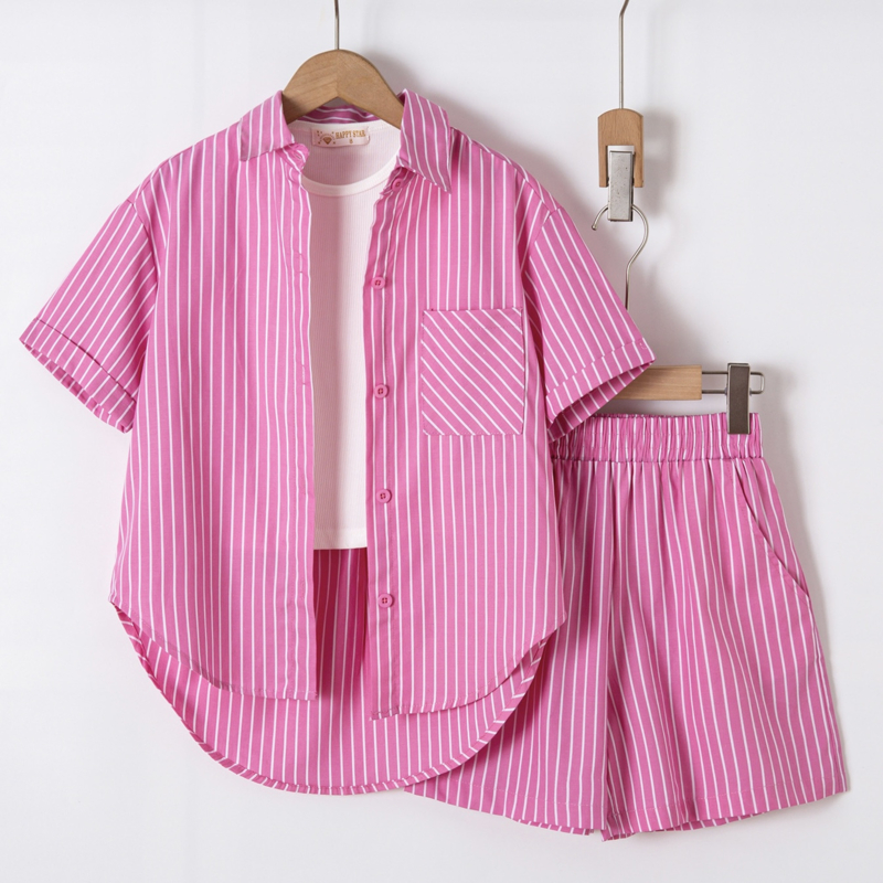 Artikelnummer: 8536r OverzichtDit vrolijke 3-delige meisjes zomersetje is een echte eyecatcher voor warme dagen. De set bestaat uit een roze wit gestreept blouse-overhemd met korte mouwen, een comfortabele witte top en een bijpassende gestreepte short met elastische tailleband. Het overhemd heeft een trendy borstzakje en kan zowel open als dicht gedragen worden voor verschillende looks.