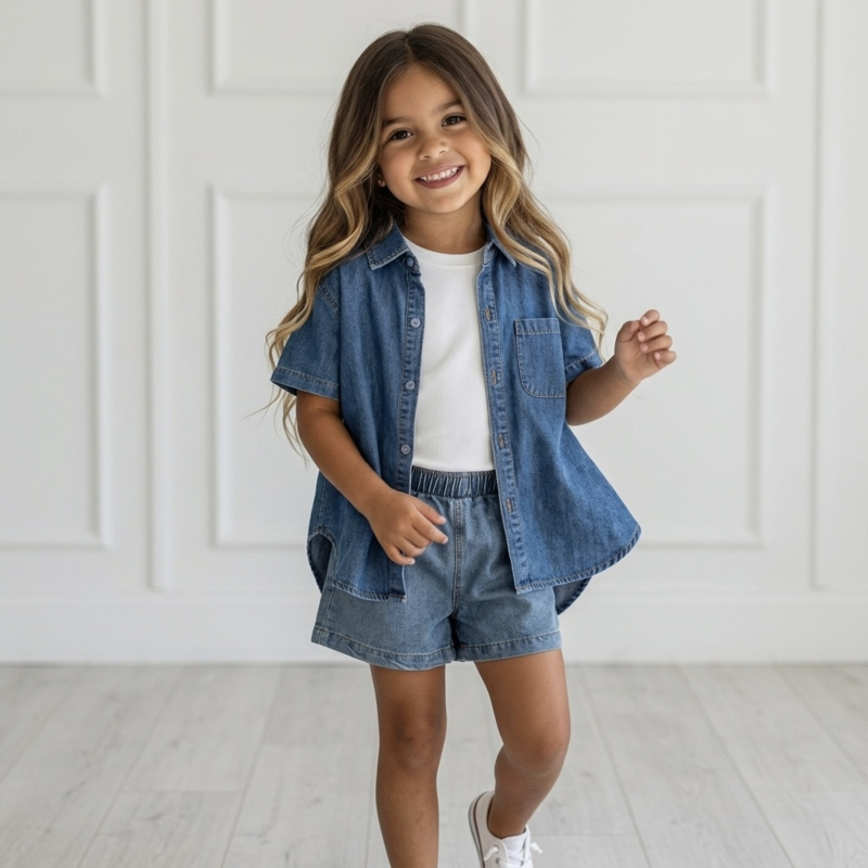 Dit stoere en trendy 3-delige denim meisjes setje is een perfecte outfit voor de zomer. De set bestaat uit een spijkerblouse met korte mouwen, een basic witte top en een bijpassende denim short met elastische tailleband. De blouse heeft een borstzakje en kan zowel open als dicht gedragen worden voor verschillende stijlen.