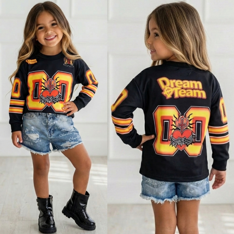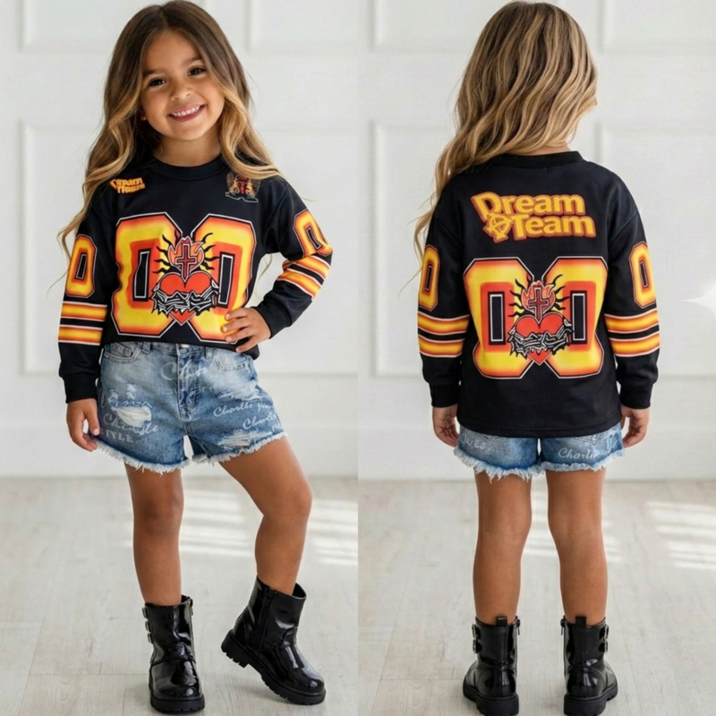 Laat jouw mini shinen in deze stoere Dream Team 8 Jersey Top! Dit sportieve shirt heeft een opvallende grote “8” print met een edgy graphic design in rood, geel en zwart – een echte blikvanger.