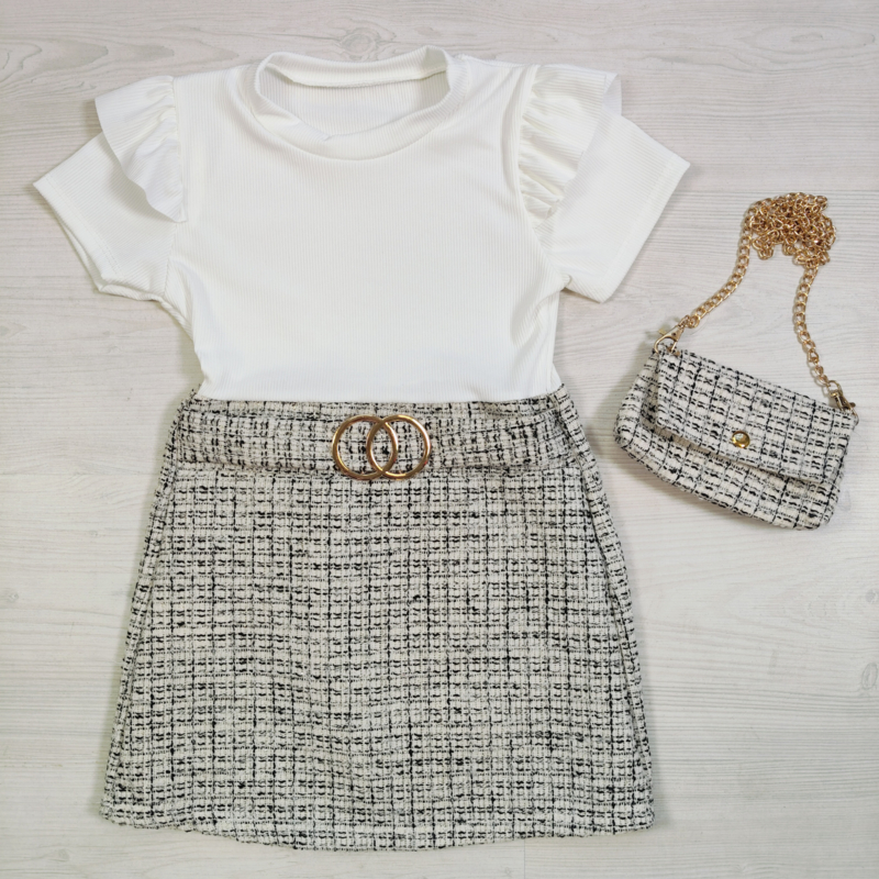 Artikelnummer: HN.70516w ww2 OverzichtDeze elegante meisjes jurk heeft een luxe uitstraling en is perfect voor een stijlvolle look! De combinatie van een zachte rib top met ruffle mouwtjes en een chique tweed rokje geeft dit jurkje een echte designer vibe.