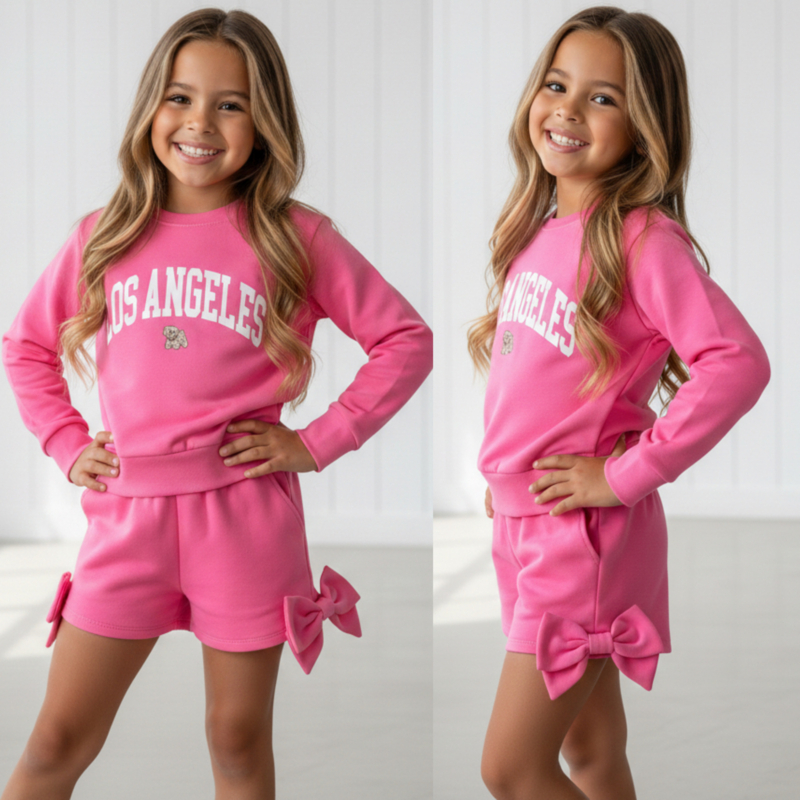 Artikelnummer: HN.3768 ww1 OverzichtDe LA Bow Lounge Set is de perfecte combinatie van sportief en super girly. Deze tweedelige meisjes set bestaat uit een comfortabele sweater met “Los Angeles” opdruk en een bijpassende short met een grote strikdetail aan de zijkant.