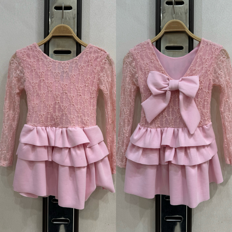 Artikelnummer: HN.8332r ww1 OverzichtDe Luna Lace Ruffle Jurk is een droomjurkje voor kleine prinsessen! 💕 De elegante kanten top met lange mouwen geeft een chique uitstraling, terwijl de speelse, gelaagde rok zorgt voor een vrolijke en zwierige look. De diepe V-rug met grote satijnen strik maakt het jurkje extra bijzonder – prachtig van zowel de voor- als achterkant.