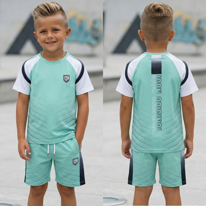 Artikelnummer: 1020-2 OverzichtDit stoere ICON zomersetje voor jongens is perfect voor warme dagen en actieve avonturen. De set bestaat uit een sportief mintkleurig T-shirt met witte mouwen en een bijpassende short. Het ademende materiaal zorgt voor extra comfort tijdens spelen, sporten of relaxen in de zon.