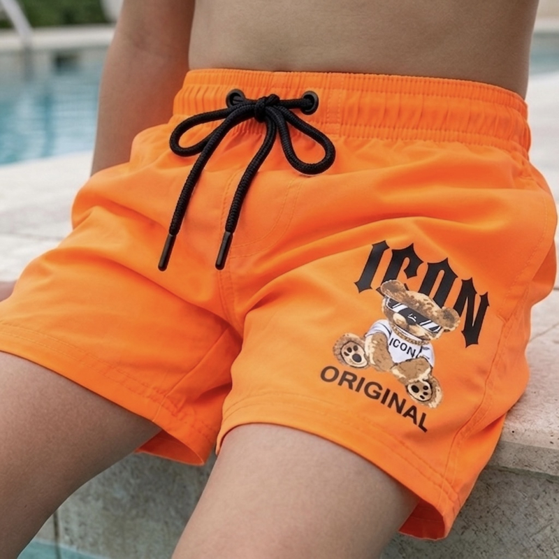 Artikelnummer: 1656o OverzichtDeze stoere ICON zwemshort voor jongens is een echte zomerfavoriet. De feloranje kleur zorgt voor een opvallende en sportieve look, terwijl de iconische ICON bear print met zonnebril de short een speelse en trendy uitstraling geeft.