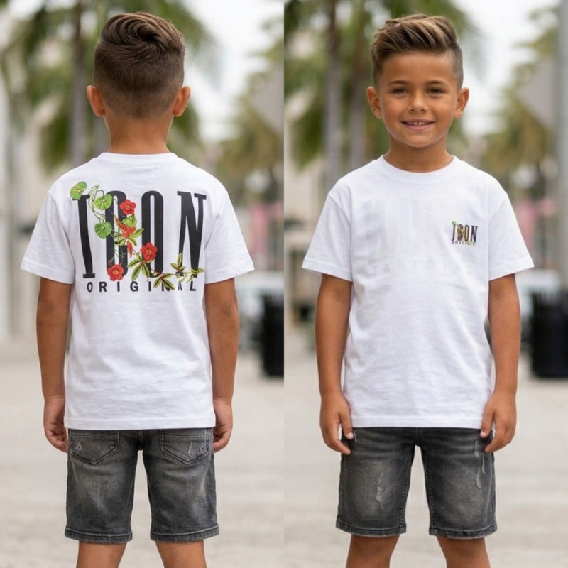 Artikelnummer: 1722w OverzichtDit ICON T-shirt voor jongens heeft een frisse en zomerse uitstraling. De voorkant is minimalistisch met een klein ICON Original logo, terwijl de achterkant een grote ICON backprint met kleurrijke bloemen en bladeren laat zien. Dit geeft het shirt een unieke combinatie van streetwear en zomerse vibes.