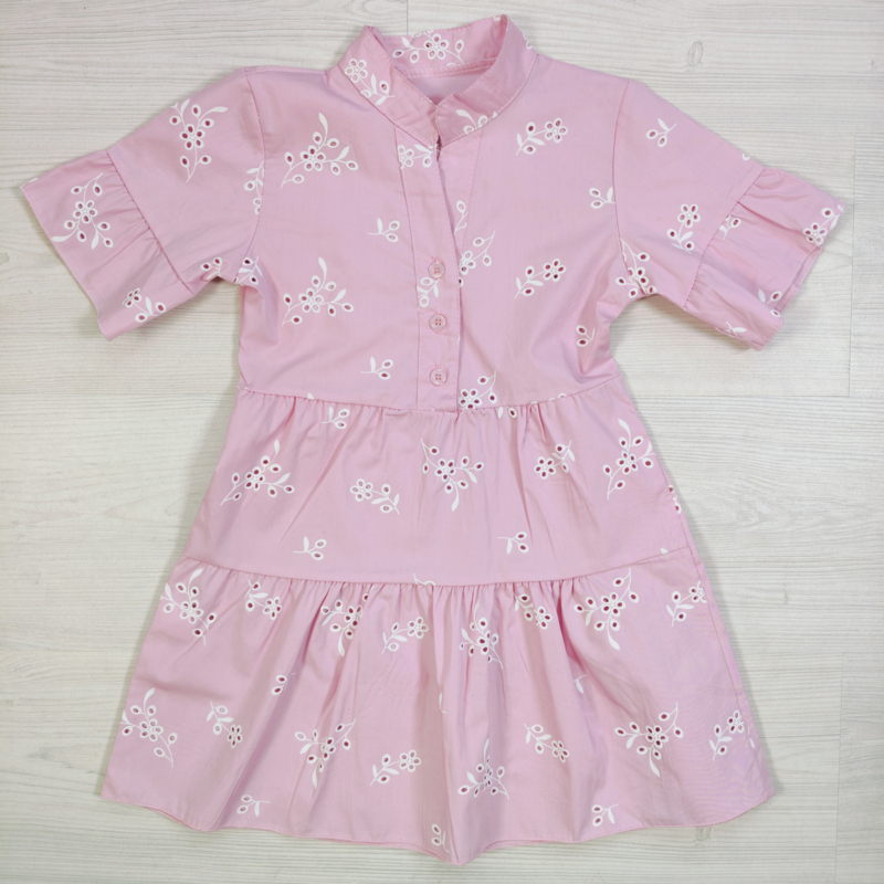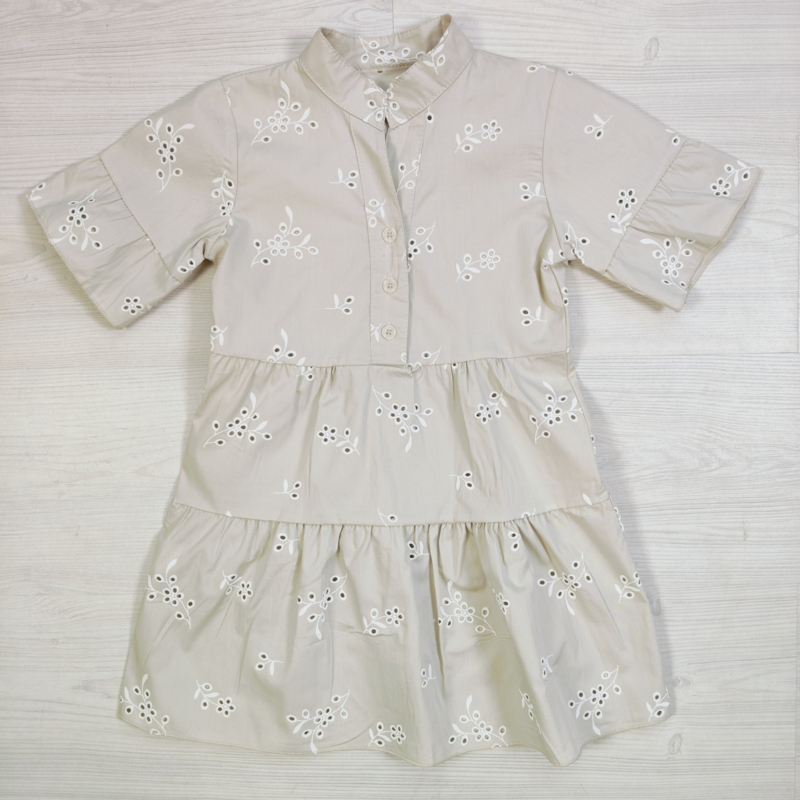 Artikelnummer: HN.70606 OverzichtDeze stijlvolle meisjes jurk met broderie bloemenprint is een perfecte combinatie van elegantie en comfort. De jurk heeft een charmant kraagje met knoopsluiting en speelse korte mouwen met subtiele ruffle, wat zorgt voor een verzorgde en trendy uitstraling.