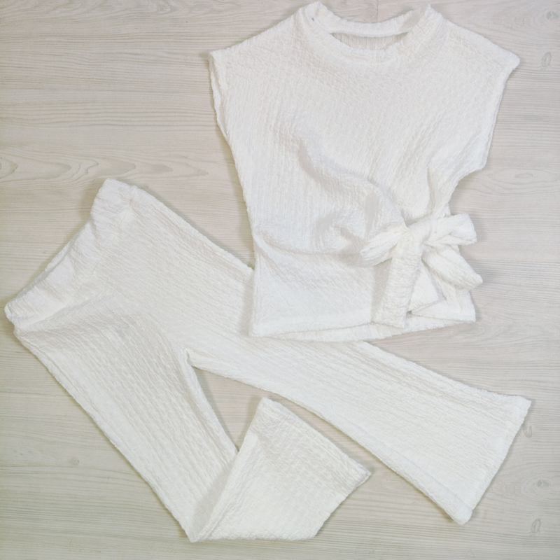 Artikelnummer: HN.70609w OverzichtDeze stijlvolle meisjes tweedelige set met structuurstof is perfect voor een trendy en comfortabele outfit. De set bestaat uit een elegante top met strikdetail in de taille en een bijpassende flared broek, wat zorgt voor een moderne en speelse look.