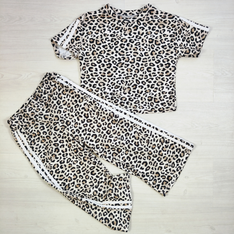 Artikelnummer: HN.26109b OverzichtDeze trendy meisjes luipaard set met sportstrepen is perfect voor een stoere en modieuze look. De set bestaat uit een korte top met korte mouwen en een bijpassende flared broek, beide uitgevoerd in een opvallende leopard print.