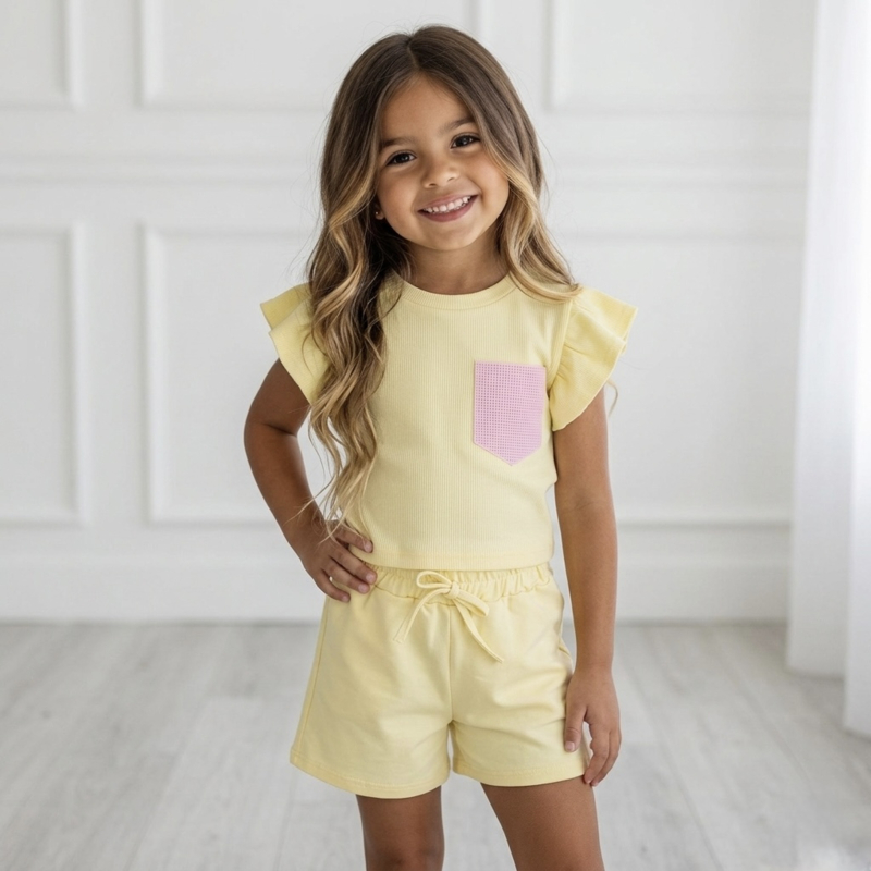 Artikelnummer: HN.70618g OverzichtDeze vrolijke meisjes zomer set met ruffle mouwen is perfect voor een comfortabele en trendy look. De set bestaat uit een T-shirt met speelse ruches aan de mouwen en een luchtig shortje met elastische tailleband, waardoor de outfit heerlijk zit op warme dagen.