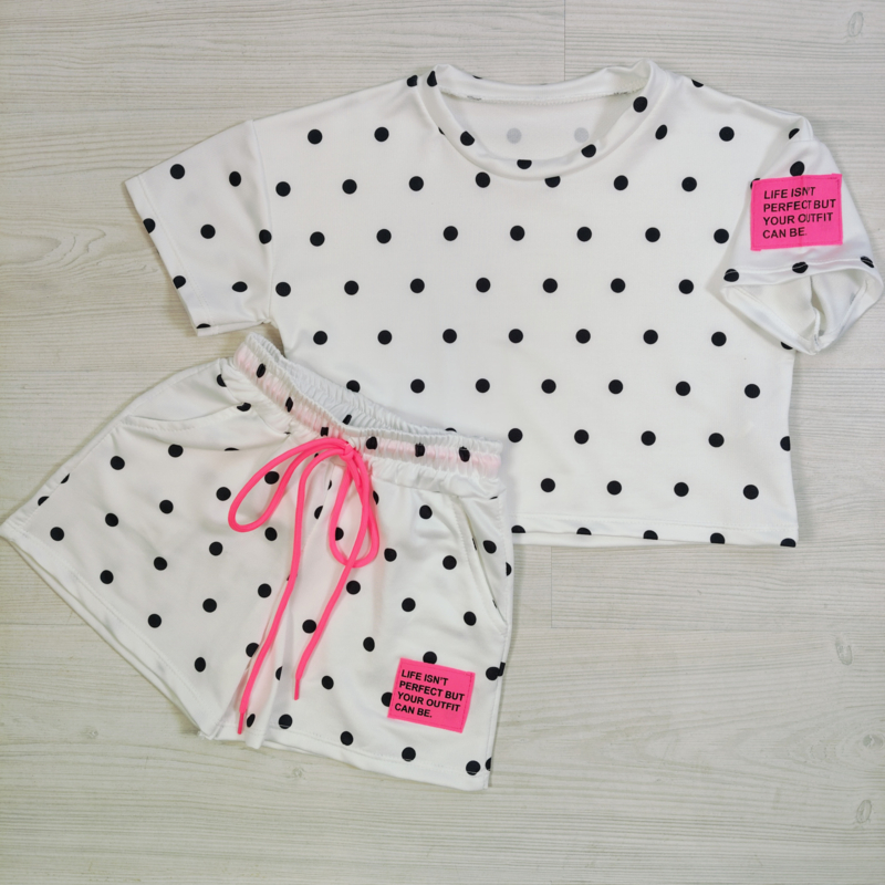 Artikelnummer: HN.70599w OverzichtDeze trendy meisjes stippen set is perfect voor een sportieve en vrolijke zomerlook. De set bestaat uit een kort T-shirt met polka dot print en een comfortabel shortje met elastische tailleband, waardoor de outfit zowel stijlvol als heerlijk comfortabel zit.