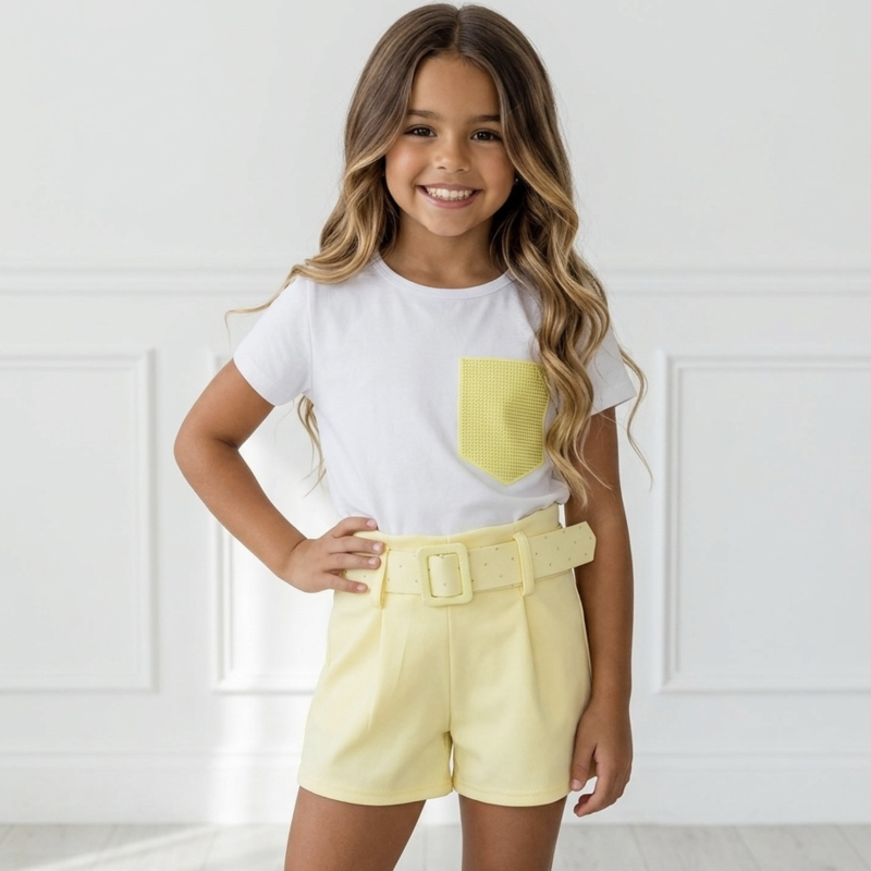 Artikelnummer: HN.70610g OverzichtDeze stijlvolle meisjes zomer set met short en T-shirt is perfect voor een trendy en comfortabele look. De set bestaat uit een basic T-shirt met een glinsterend borstzakje en een elegante high-waist short met bijpassende riem.