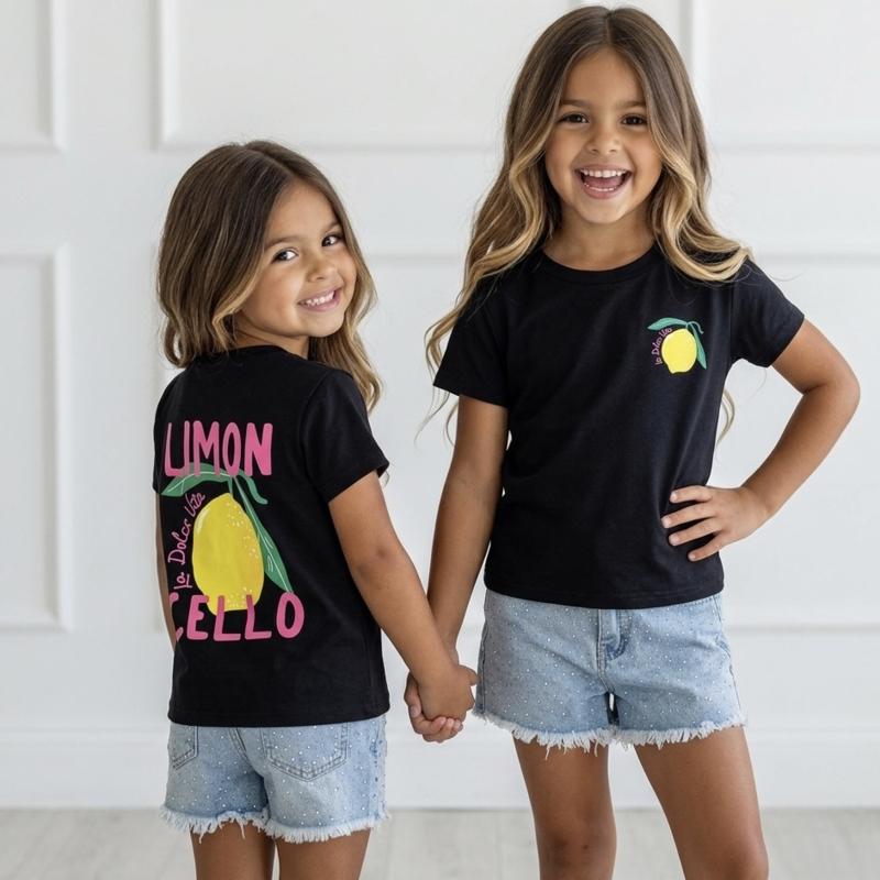 Dit vrolijke meisjes T-shirt met lemon print is een echte zomerse eyecatcher. Het shirt heeft een speelse citroen graphic met de tekst “Limon Cello – La Dolce Vita”, wat zorgt voor een frisse en trendy uitstraling.