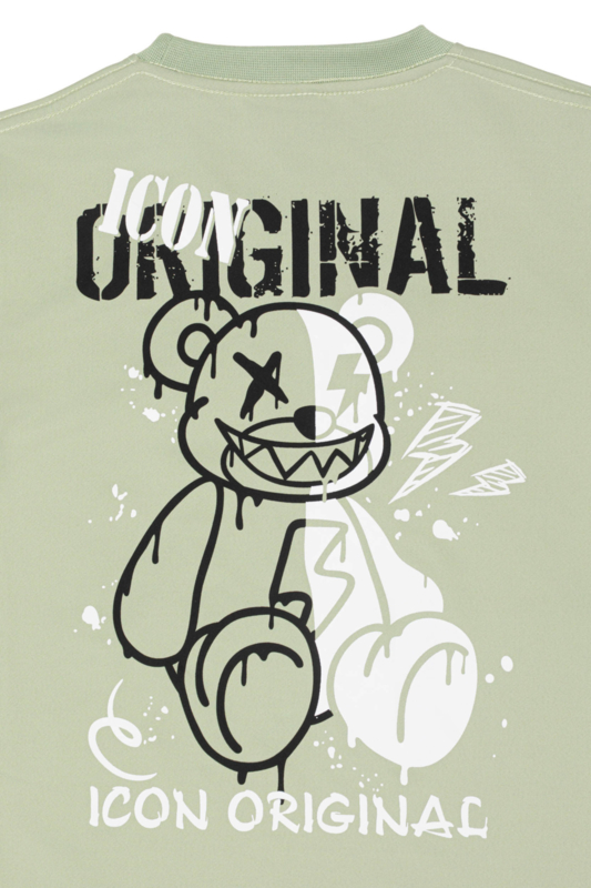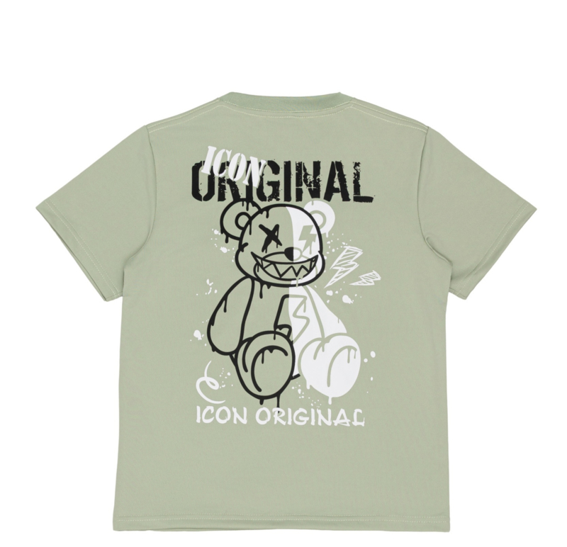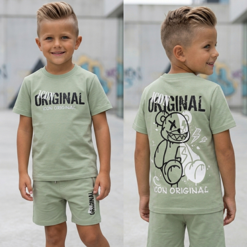 De set bestaat uit een groen T-shirt met opvallende bear-print op de achterkant en bijpassende short met ritszakje. De graphic print met geel accent geeft de outfit een echte urban vibe.