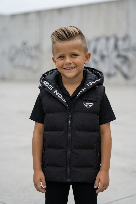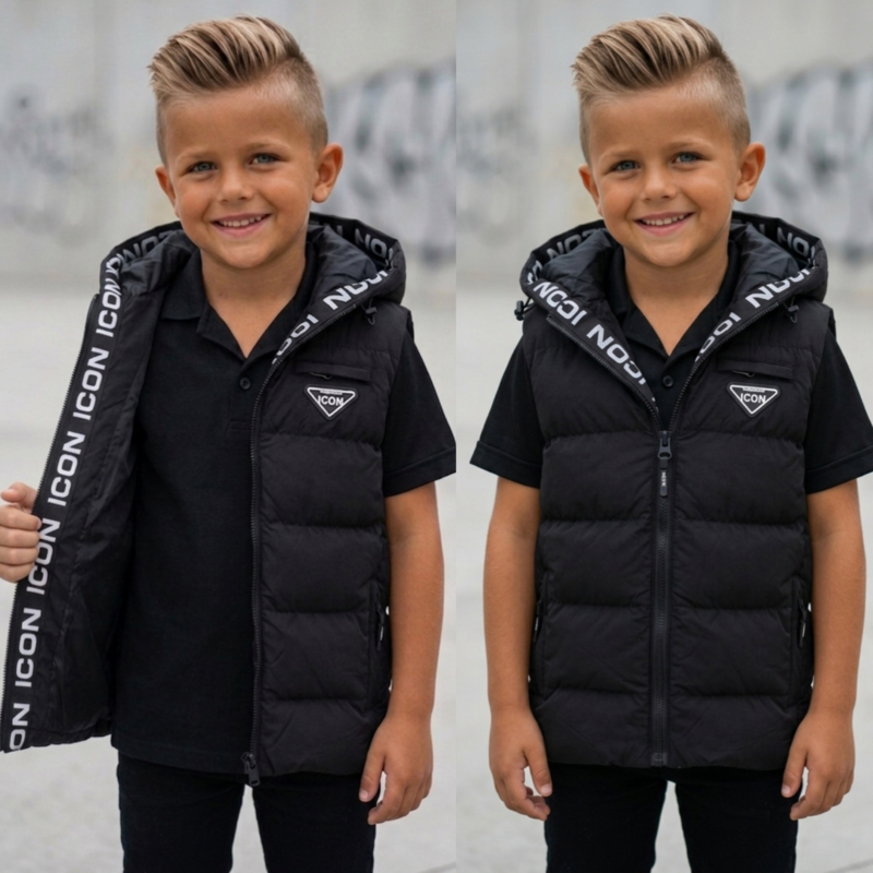 Artikelnummer: 1660z OverzichtDeze stoere ICON bodywarmer voor jongens is een echte must-have voor een trendy streetwear look. De bodywarmer heeft een moderne zwarte kleur en opvallende ICON details langs de capuchon, wat zorgt voor een sportieve en herkenbare uitstraling.