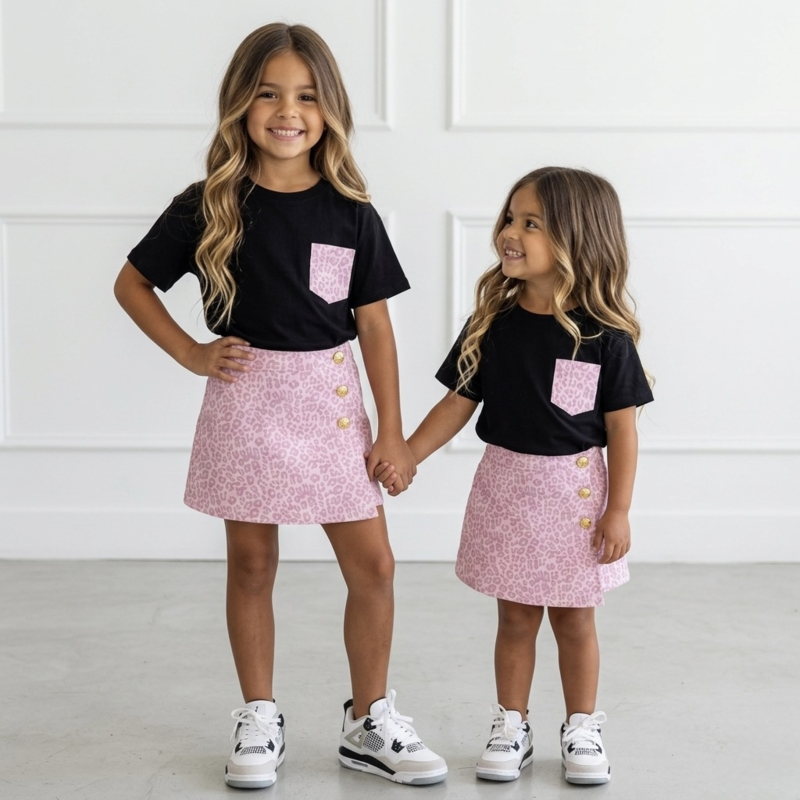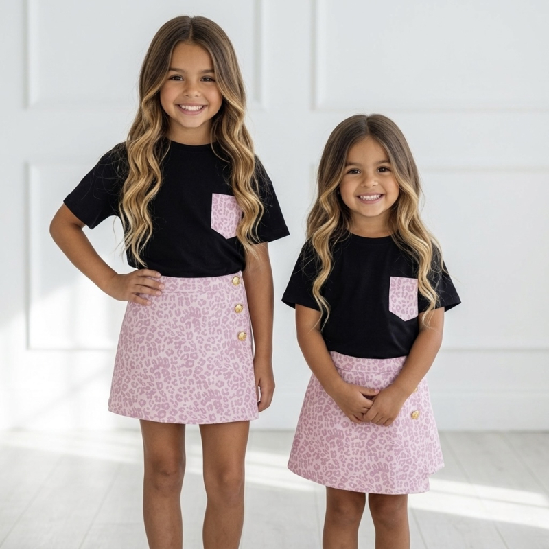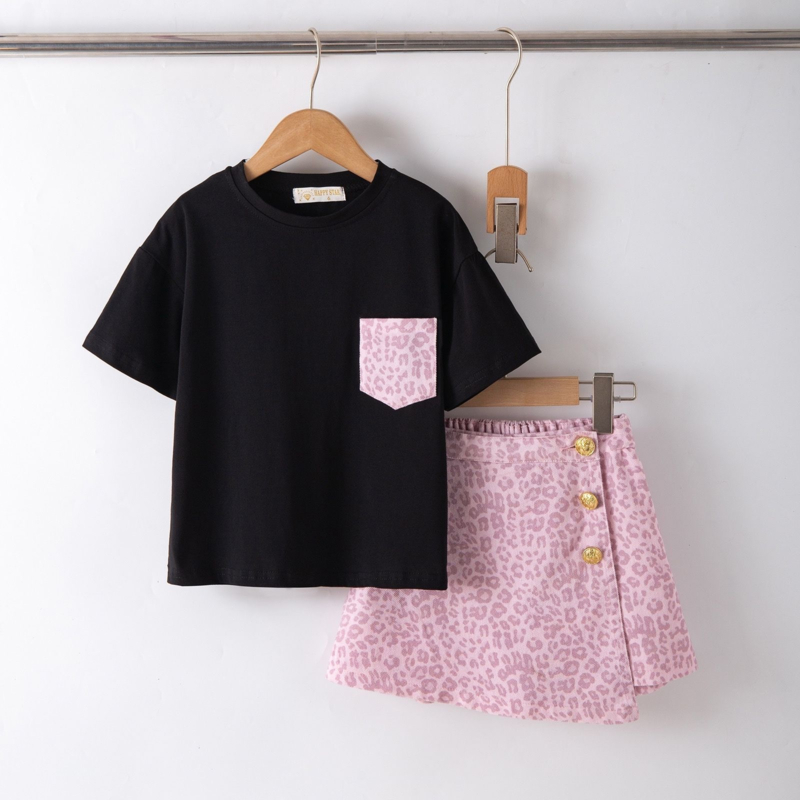 Artikelnummer: LG.1037 OverzichtDit trendy meisjes setje met leopard skort is de perfecte combinatie van stoer en girly. De set bestaat uit een zwart T-shirt met subtiel leopard borstzakje en een roze leopard skort (rokje met broekje) met luxe goudkleurige knopen.
