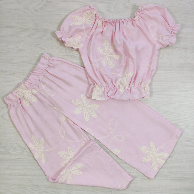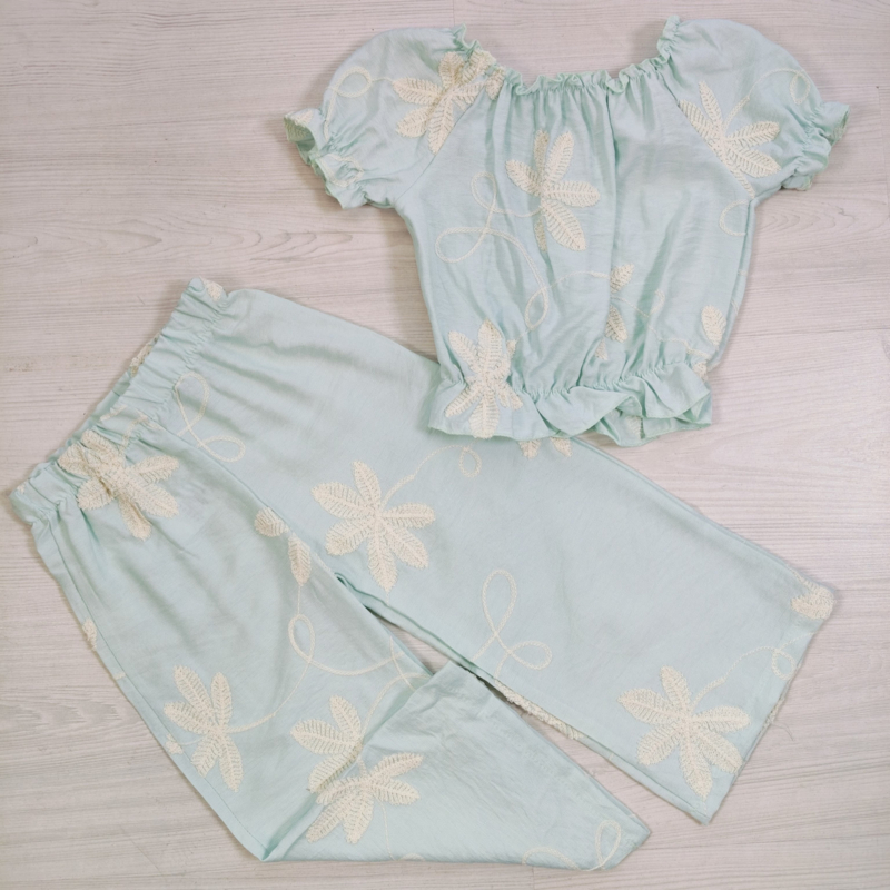 Artikelnummer: HN.5095 OverzichtDeze prachtige meisjes zomerset met geborduurde bloemen is perfect voor warme dagen! De set bestaat uit een schattige crop top met pofmouwtjes en een comfortabele flared broek. De subtiele bloemenborduursels geven de outfit een romantische en stijlvolle uitstraling.