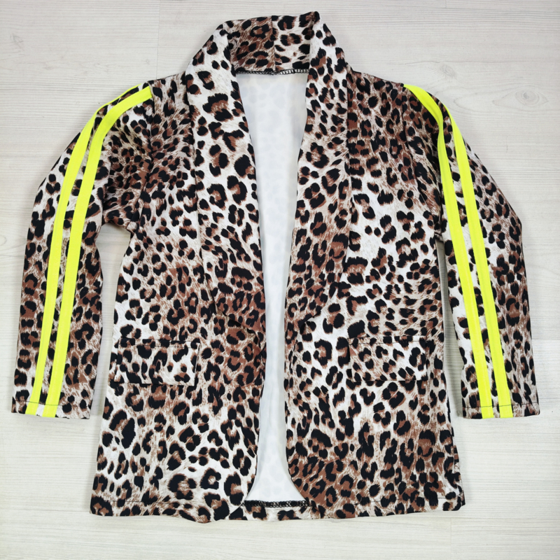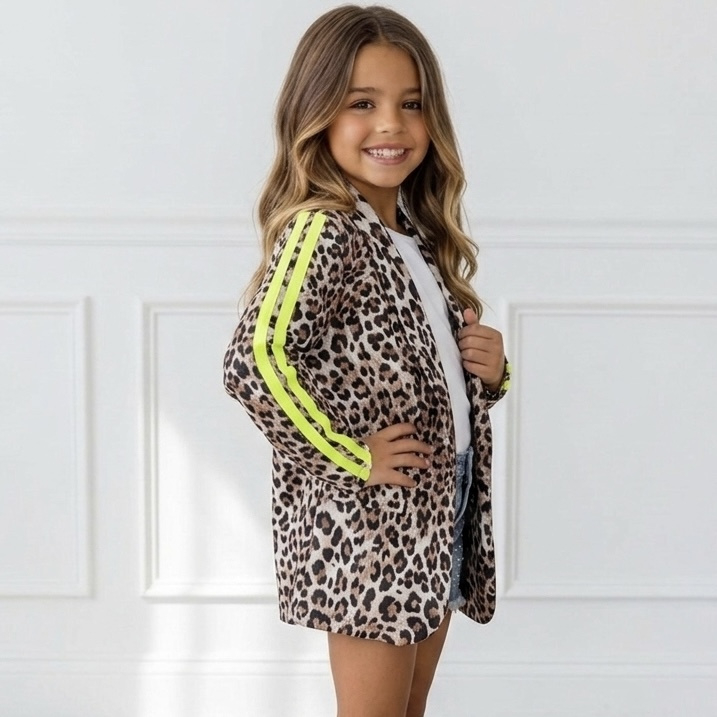 Artikelnummer: HN. 7023lg OverzichtDeze opvallende meisjes leopard blazer met neon strepen is dé perfecte mix van stoer en trendy! De blazer heeft een stijlvolle luipaardprint en wordt extra bijzonder door de neon strepen op de mouwen, wat zorgt voor een echte fashion statement.