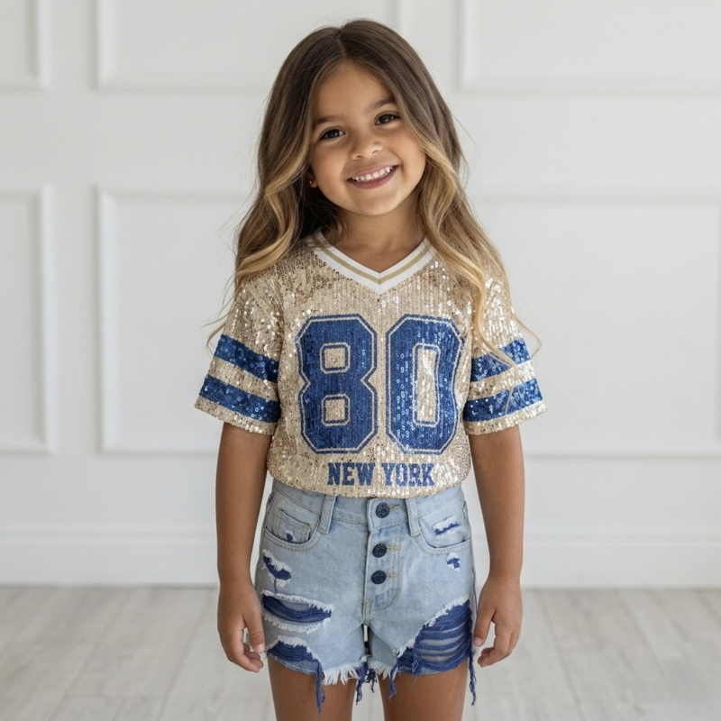 Dit opvallende meisjes pailletten shirt “80 New York” is een echte eyecatcher! De top is volledig bedekt met glinsterende pailletten en heeft een stoere sportieve look met het nummer 80 en New York print.