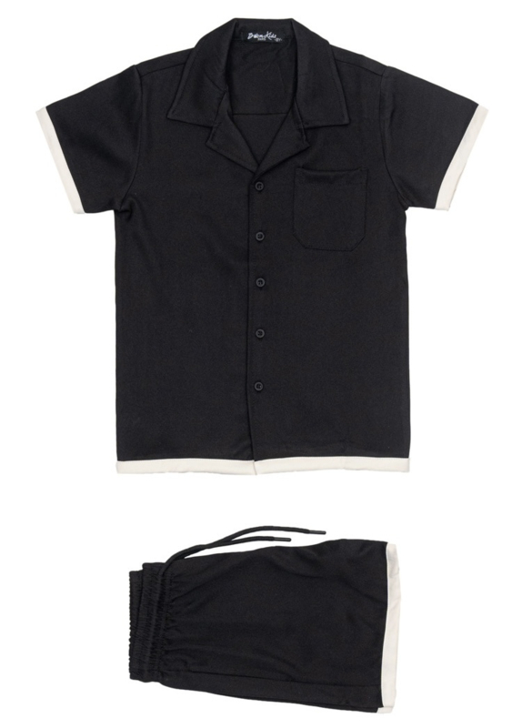 Het setje bestaat uit een stijlvol overhemd met korte mouwen, knoopsluiting en borstzakje. De contrasterende lichte randen aan de mouwen en onderzijde geven de outfit een luxe en moderne uitstraling. De bijpassende short heeft een elastische tailleband met aantrekkoord voor een perfecte pasvorm en extra comfort.