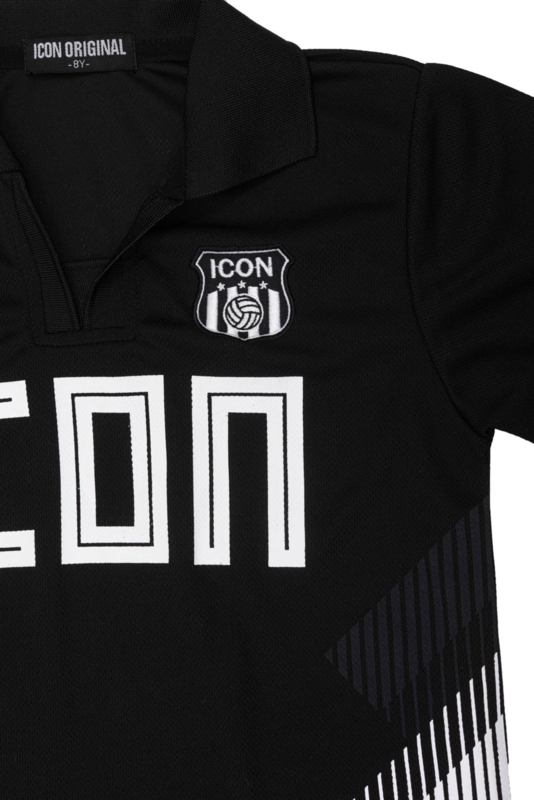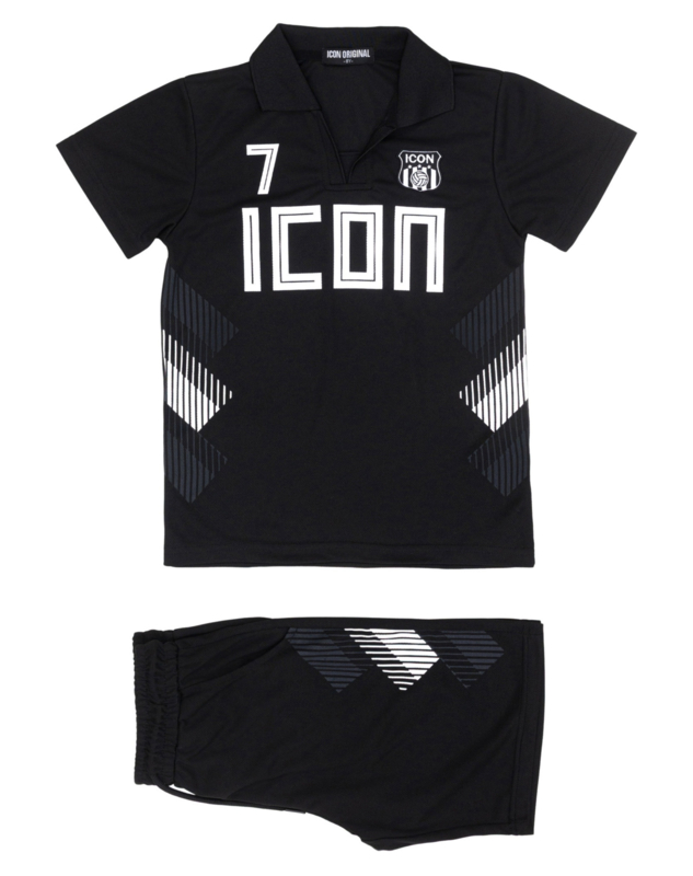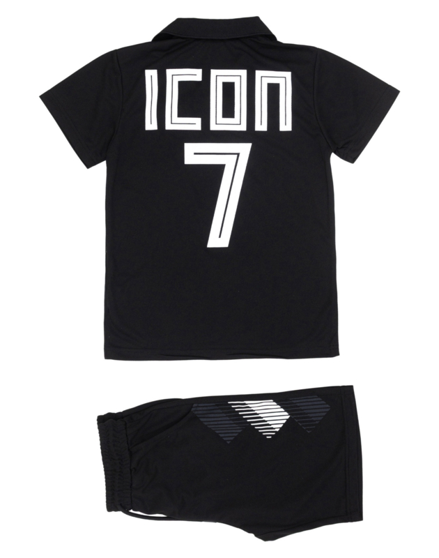 Het T-shirt heeft een polo-kraag, opvallende “ICON” print en nummerdetail, wat zorgt voor een echte voetbalstijl uitstraling. De achterkant is voorzien van een grote print met nummer 7, wat de sportieve look compleet maakt. De bijpassende short heeft een elastische tailleband voor extra comfort en bewegingsvrijheid.