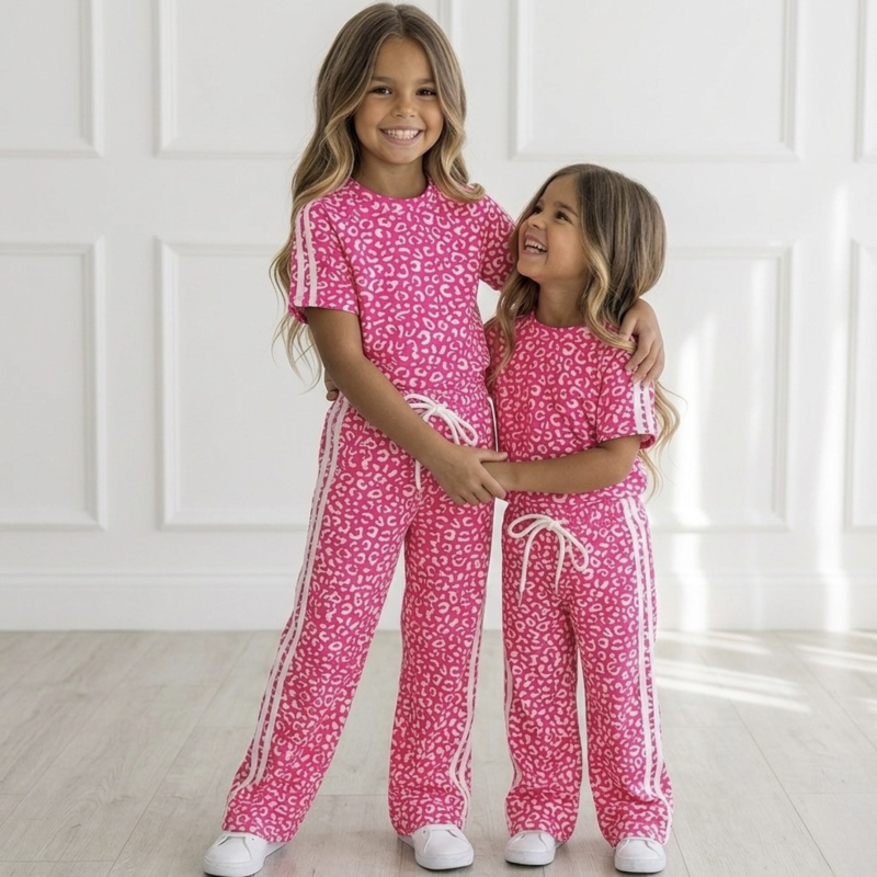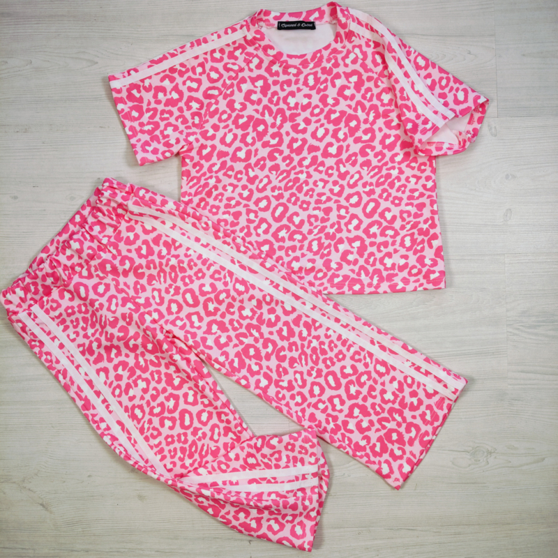 OverzichtDeze neon roze luipaard meisjes set is een echte eyecatcher! De opvallende hot pink animal print zorgt voor een speelse en trendy look, terwijl de sportieve zijstrepen het setje een stoere uitstraling geven.