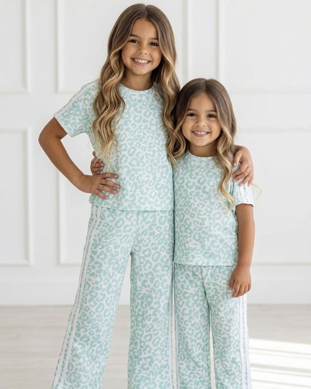 OverzichtDeze mintgroene luipaard meisjes set is dé perfecte combinatie van trendy en comfortabel! De zachte pastel animal print geeft een frisse, zomerse uitstraling, terwijl de sportieve zijstrepen zorgen voor een stoere touch.
