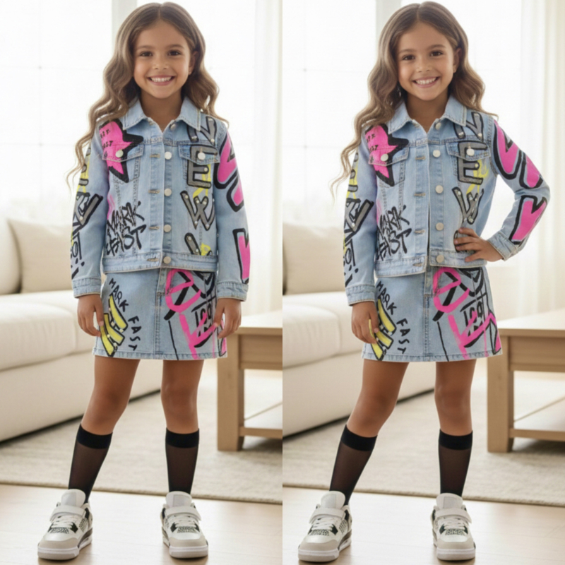 Artikelnummer: FG23018r ww1 OverzichtDit denim spijkersetje met kleurprint is een echte statement outfit voor meiden die opvallen durven. De set bestaat uit een spijkerjasje met knoopsluiting en een bijpassend rokje, beide voorzien van een grafische print met roze en gele accenten.