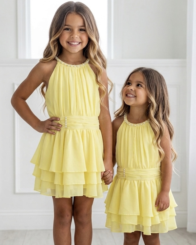 Artikelnummer: LG.YYm592g OverzichtDeze elegante meisjes jurk met parel details is een echte eyecatcher voor speciale gelegenheden! De jurk heeft een stijlvolle halter hals met parelbandje, wat zorgt voor een luxe en chique uitstraling. De soepel vallende chiffon stof en de speelse laagjes rok geven de jurk een zwierige, feestelijke look.