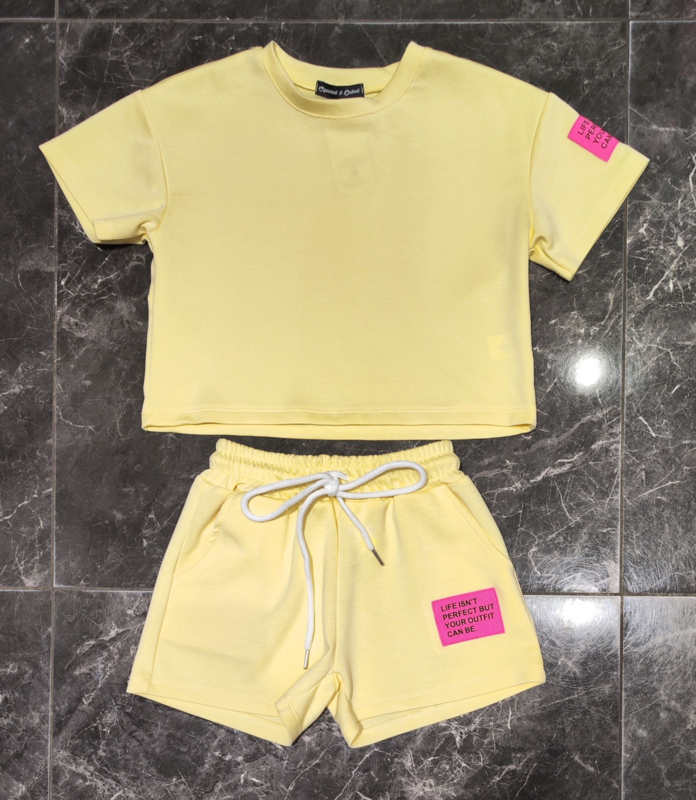 Artikelnummer: HN.26063g ww1 OverzichtOp zoek naar een vrolijke, comfortabele én trendy zomerset? Deze gele 2-delige sweatset voor meisjes is dé perfecte combinatie van stijl en gemak. De set bestaat uit een cropped T-shirt met korte mouwen en een bijpassende short met elastische tailleband en koordsluiting. De frisse pastelgele kleur krijgt een speelse touch door de felroze quote patch op zowel het shirt als de broek.